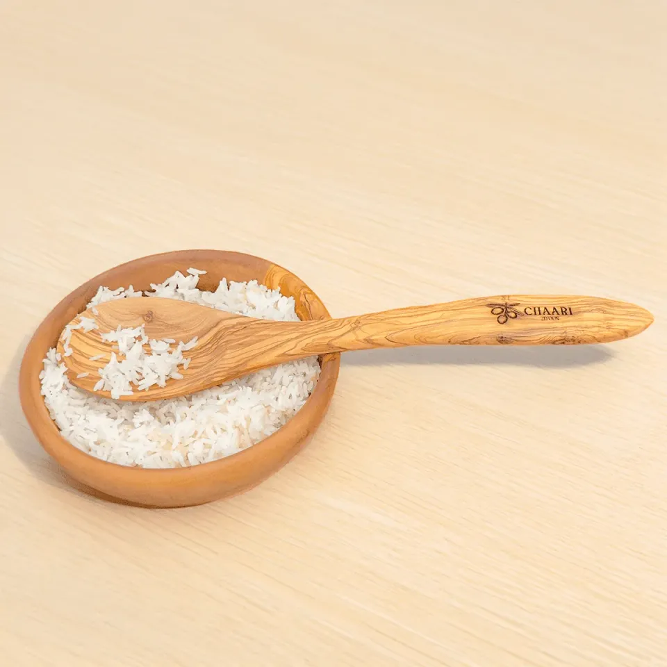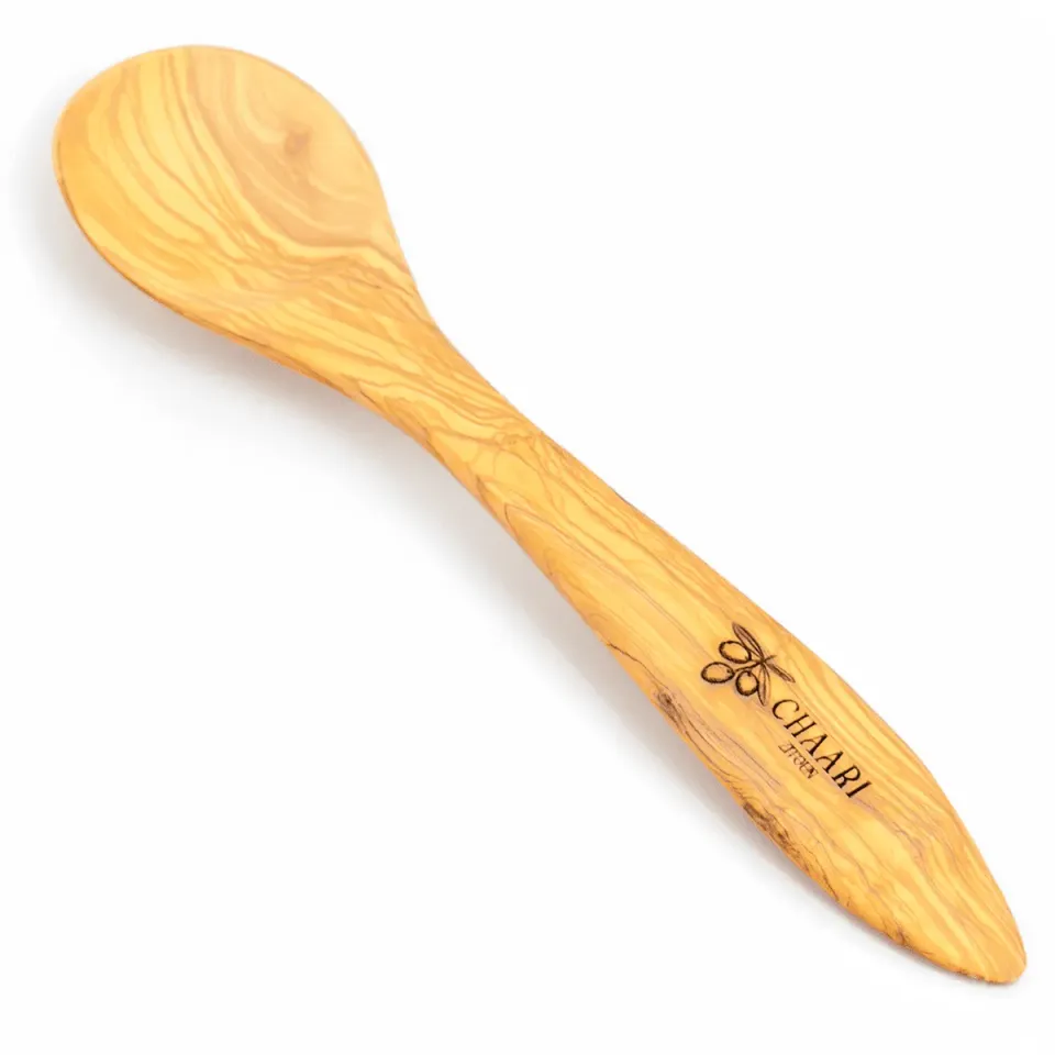 I use this spoon every time I make pasta. The olive wood doesn't scratch my pans and it feels really solid. The grain pattern is unique — you can tell it's handmade.